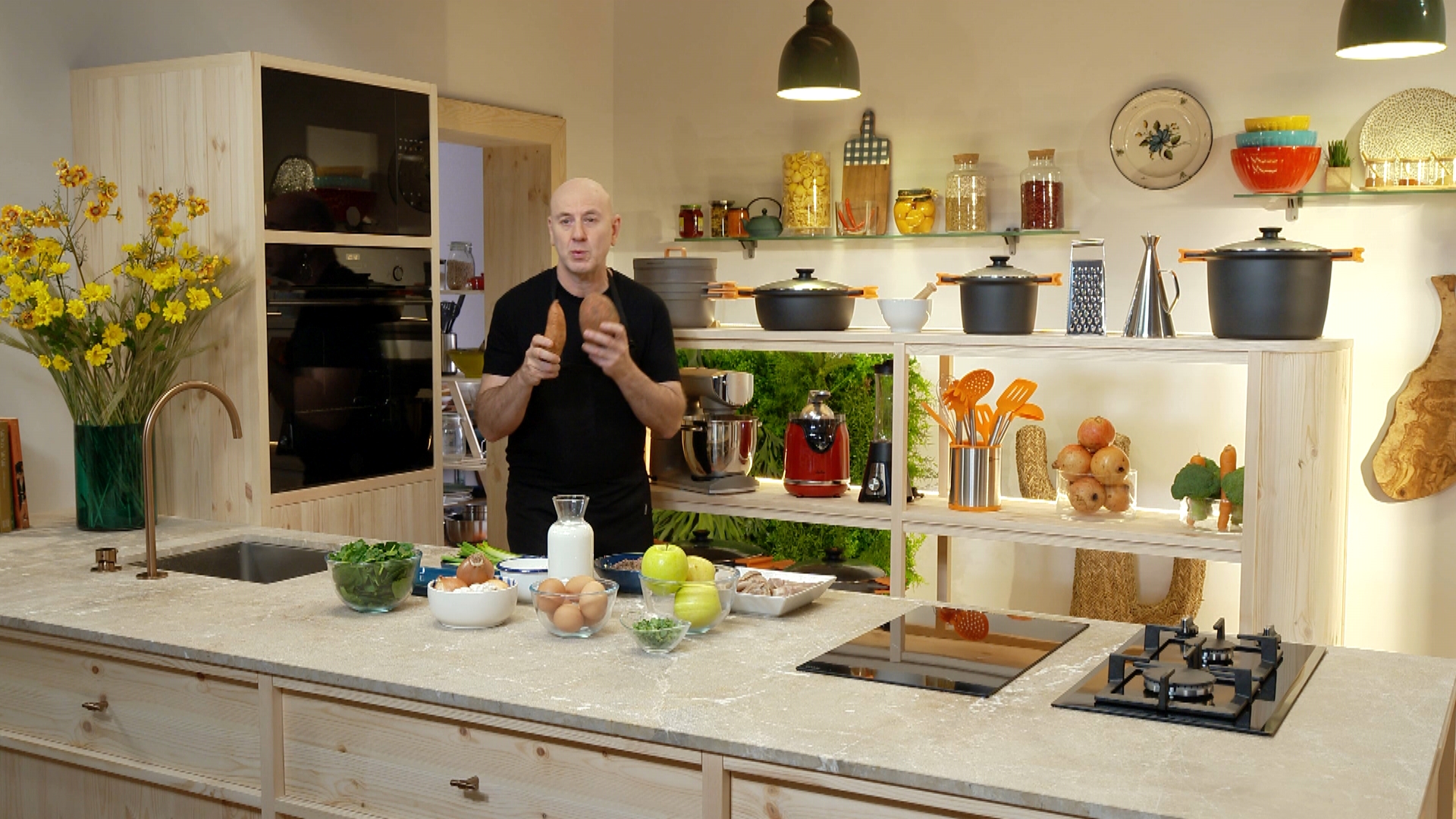 En aquest capítol cuinarem moniatos farcits amb porc i poma. Primer de tot enfornarem els moniatos. Mentre refredin sofregirem espinacs i tallarem la carn del farciment. Així, mateix, courem pomes i les triturarem per fer una salseta. Li donarem un toc cruixent amb talls d'orella de porc fregits