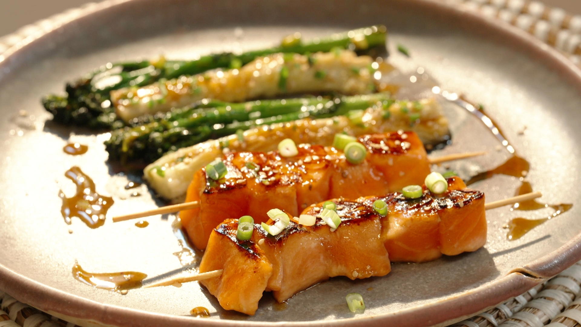 En aquest capítol cuinarem un broqueta de salmó amb albergínia japonesa. Rostirem les albergínies i les tremparem. Elaborarem una salsa de sabors exòtics i després l'afegirem a bimi, que és un tipus de bròquil. Torrarem el peix i ho emplatarem tot junt.